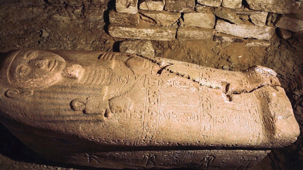 The current excavation season revealed the granite sarcophagus, "covered in texts" to "safeguard the deceased" and "scenes representing the sons of the god Horus," according to the antiquities ministry.