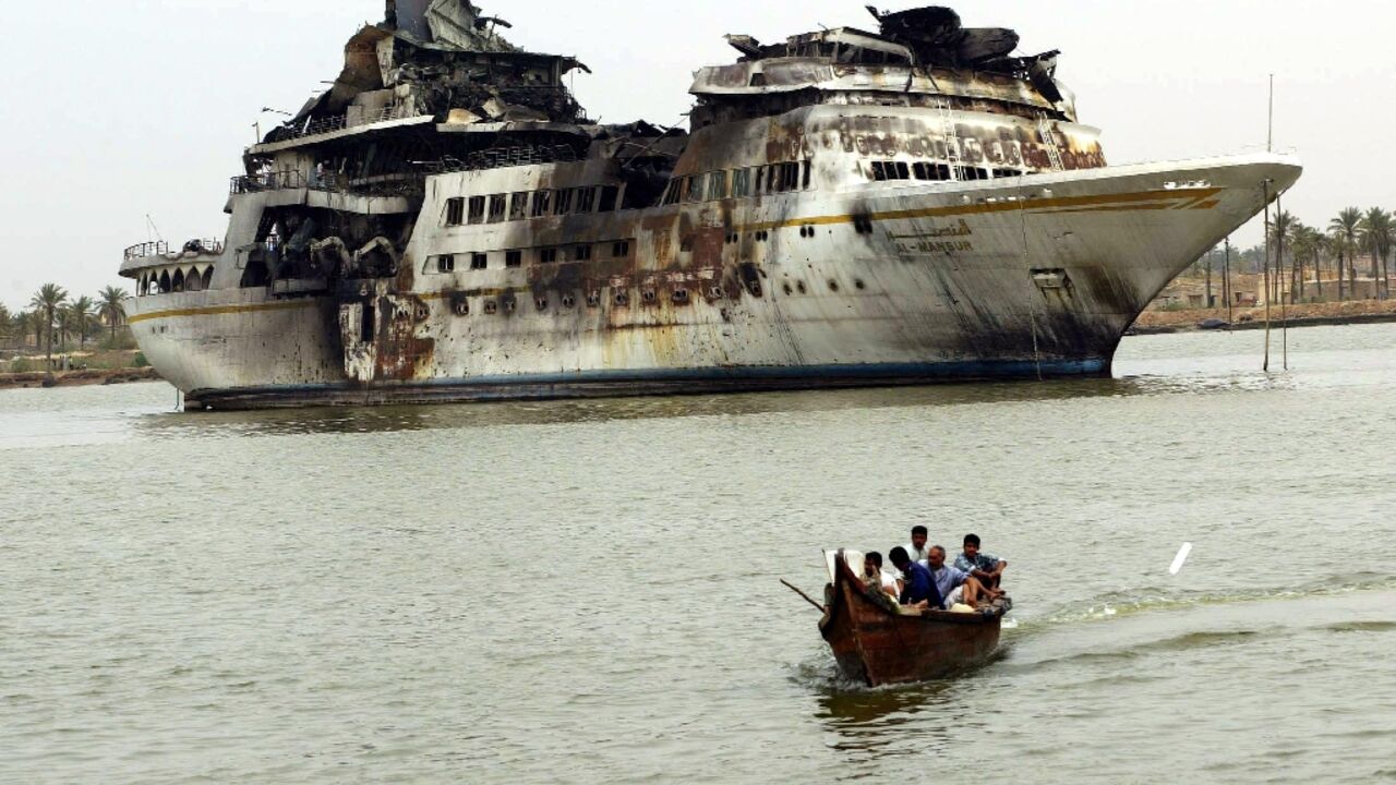 The Al-Mansur (Victorious) now lays on its side, having capsized after it was struck during the 2003 US-led invasion of Iraq that ended Saddam's decades of iron-fisted rule.