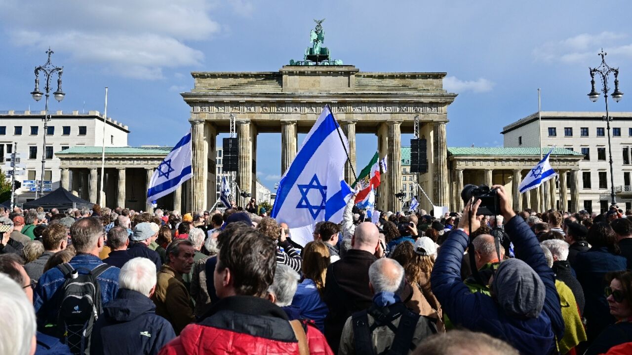 Police said around 10,000 people gathered at Brandenburg Gate for the demonstration in solidarity with Israel and in opposition to anti-Semitism, though organisers put the figure at 25,000.
