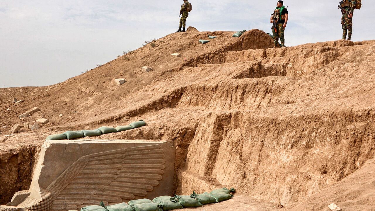 Iraqi security forces stand guard at the site of a newly-unearthed Assyrian Lamassu (human-headed winged bull) sculpture discovered with its entire wings intact by the French archaeological mission at the archaeological site of Khorsabad (also known as Dur-Sharrukin), the former Assyrian capital in the time of Sargon II (721705 BC) in Iraq's northern Nineveh province on October 24, 2023. (Photo by Zaid AL-OBEIDI / AFP) (Photo by ZAID AL-OBEIDI/AFP via Getty Images)