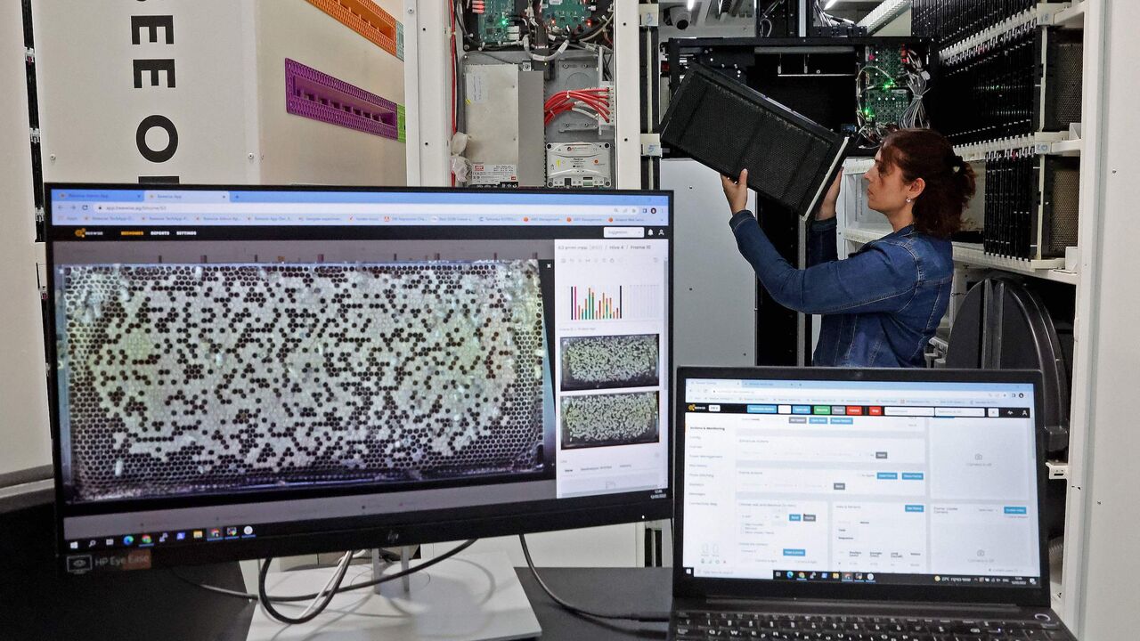 An engineer sets up new beehives, part of the high-tech Beehome project, in Israel's Kibbutz Bet Haemek in the northern Galilee, on May 14, 2022. - They function as normal hives, but apiaries built at a kibbutz in Israel's Galilee are decked out with high-tech artificial intelligence systems set to ensure longevity for these vital pollinators. (Photo by JACK GUEZ / AFP) (Photo by JACK GUEZ/AFP via Getty Images)