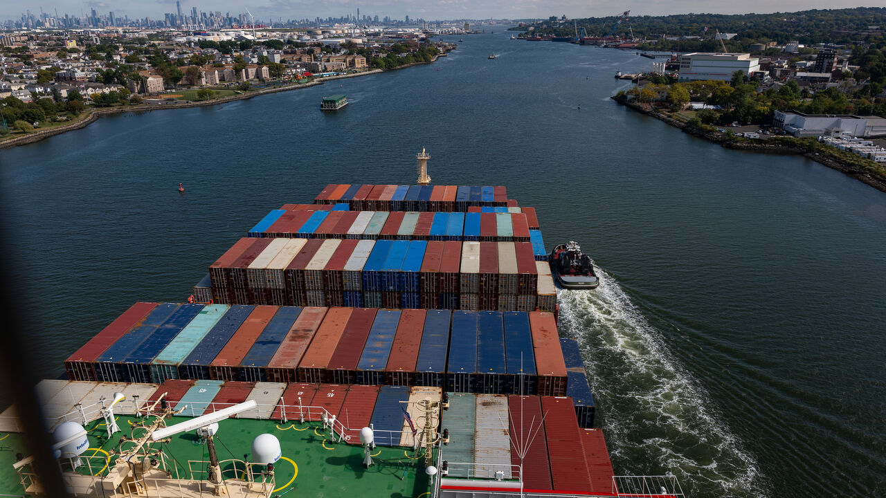 NEW YORK, NEW YORK - SEPTEMBER 30: A container ship departs the Port of Newark for the Atlantic Ocean on September 30, 2024 seen from New York City. A massive strike that could shut down ports across the East and Gulf coasts could begin at midnight as members of the International Longshoremen’s Association continue to make salary and other demands to the United States Maritime Alliance, which controls many of the ports across the country. (Photo by Spencer Platt/Getty Images)