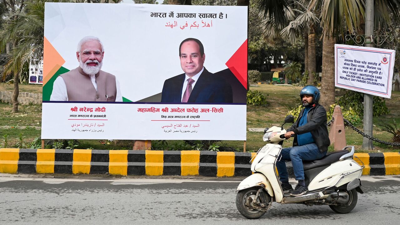 A motorist rides past a billboard welcoming Egypt's President Abdel Fattah El-Sisi, who will be chief guest at India's 74th Republic Day parade, in New Delhi on January 24, 2023. (Photo by Sajjad HUSSAIN / AFP) (Photo by SAJJAD HUSSAIN/AFP via Getty Images)