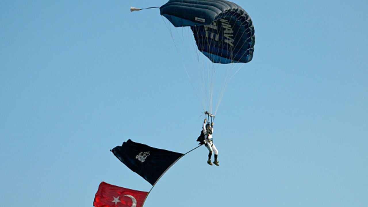 A paratrooper of the Pakistan Navy Special Service Group unfurls the Pakistan Navy flag and the national flag of Turkey during a multinational naval exercise in Karachi on February 9, 2025. (ASIF HASSAN/AFP via Getty Images)