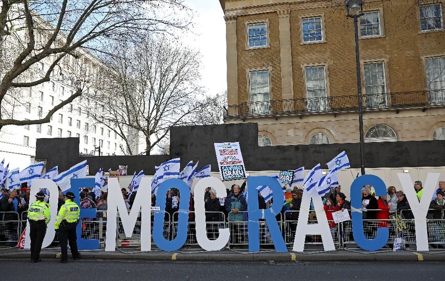 They erected the letters of the word "democracy" on nearby Whitehall, while wielding signs accusing Netanyahu of dragging Israel towards "dictatorship".