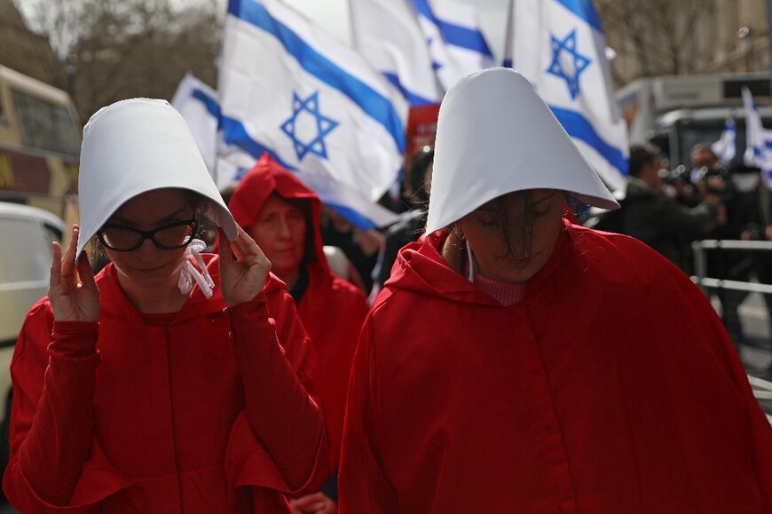Protests by pro-Palestinian groups and others opposed to Israel's judicial reforms were held near Downing Street, including women's rights campaigners dressed as characters from dystopian drama "The Handmaid's Tale".