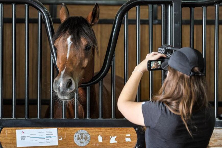 In this picture taken on February 16, 2023, a horse inside a pen is filmed by a woman with a video camera, at Al-Shaqab Equestrian Centre in Doha, which concentrates on the breeding of Arabian horses. (Photo by KARIM JAAFAR / AFP)