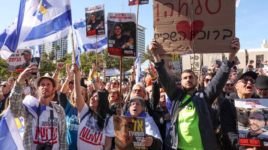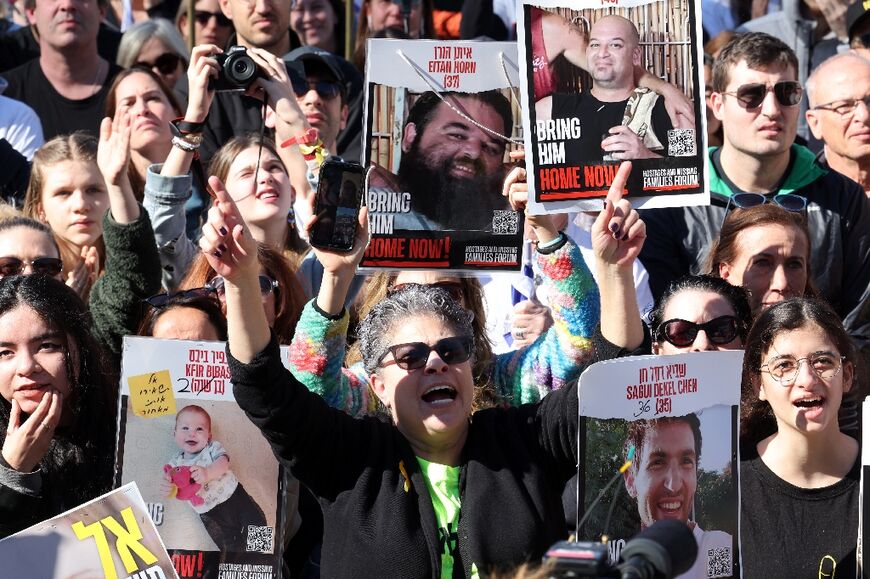 A crowd gathered in Israel's commercial hub of Tel Aviv to watch a live feed of the exchange. Many carried Israeli flags and posters with messages including "Sorry and welcome back" and "Complete the ceasefire".