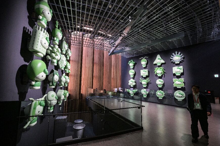 Among the more bizarre displays are 32 sculptures of Hello Kitty dressed as different types of algae -- to symbolise the slimy plant's many uses -- and a "human washing machine" that shows imagery based on the bather's heart rate.