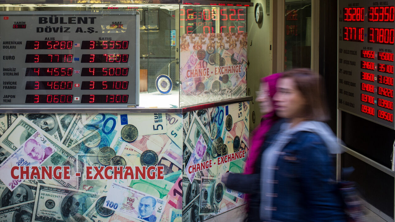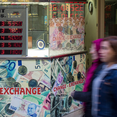 ISTANBUL, TURKEY - DECEMBER 05: People wallk past a currency exchange shop on December 5, 2016 in Istanbul, Turkey. As the Turkish Lira plunged to record lows in past weeks, President Recep Tayyip Erdogan in a speech Saturday said his political enemies were trying to sabotage the economy and urged citizens to convert their foreign currency savings into lira or gold. Borsa Istanbul, Turkey's main stock exchange, became the first institution to act on the presidents call, converting all it's cash assets to li