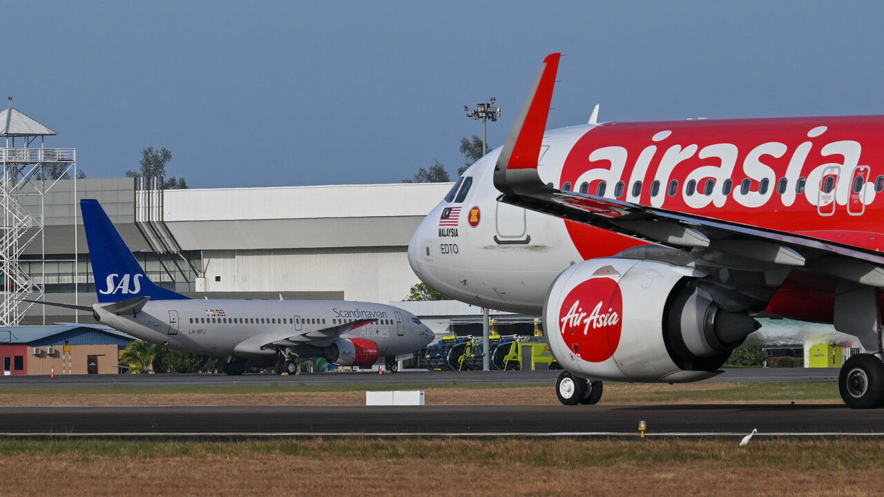 A Scandinavian Airlines (SAS) Boeing 737-700 aircraft (background L) is seen past an AirAsia plane at Langkawi International Airport on the Malaysian resort island of Langkawi on March 2, 2024, ahead of the expected departure of Norway's King Harald V who has been hospitalised on the island. Norway's King Harald V, aged 87 and in poor health, is expected to return in "a few days" from Malaysia where he is hospitalised, the royal household said February 29. (Photo by Mohd RASFAN / AFP) (Photo by MOHD RASFAN/